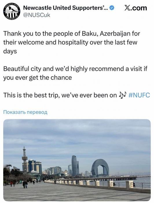 Sport1.az xəbər verir ki, İngiltərə klubunun fan qrupu X sosial şəbəkəsində Azərbaycan xalqına təşəkkür mesajı yayımlayıb. Paylaşım UEFA Çempionlar Liqasının pley-off mərhələsində keçirilən “Qarabağ” – “Nyukasl” görüşündən (1:6) bir gün sonra edilib.