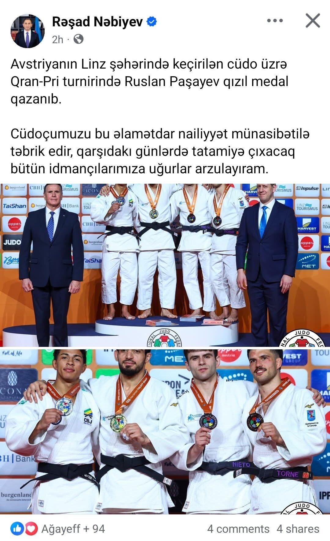 Azərbaycan Cüdo Federasiyasının prezidenti Rəşad Nəbiyev Avstriyanın Linz şəhərində keçirilən Qran-pri turnirində qızıl medal qazanan Ruslan Paşayevi (66 kq) təbrik edib.